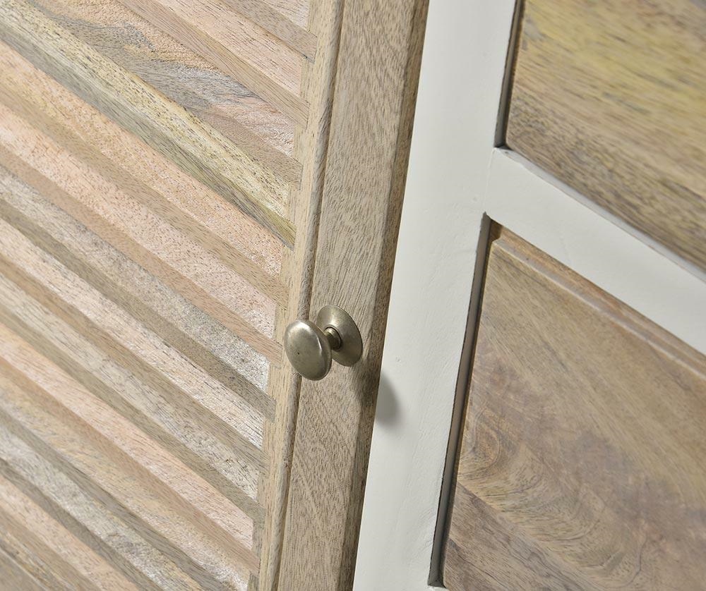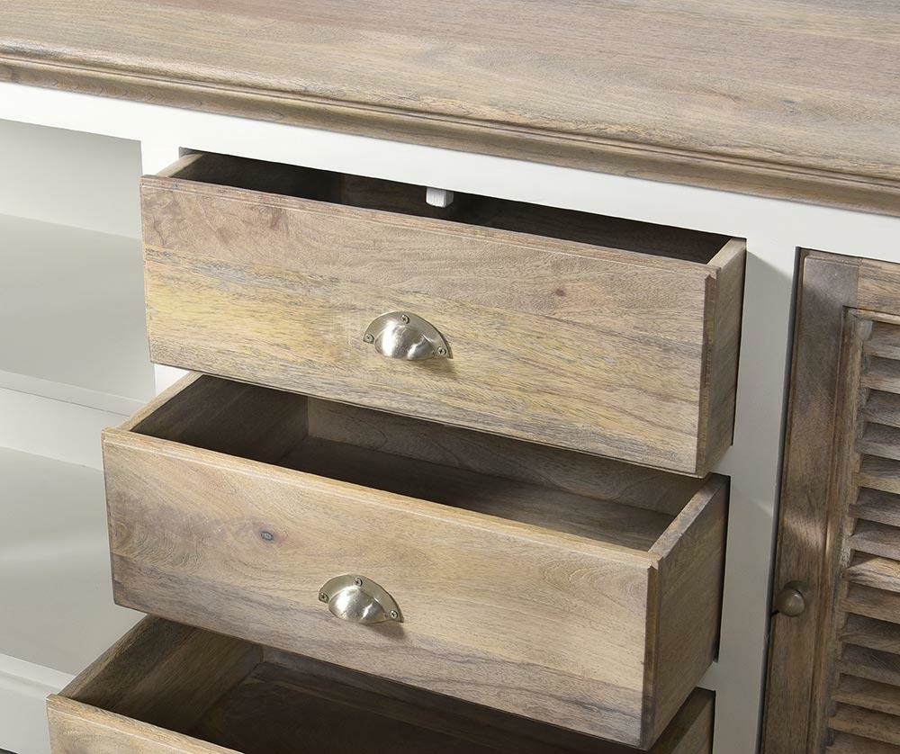Korpus mebla w kolorze antycznej bieli stanowi drewno akacjowe. Płyta MDF jest umieszczona na tylnej części mebla. Żaluzjowe drzwiczki tzw. shuttersy nawiązują do stylu nadmorskich wnętrz w Hamptons. Charakter mebla podkreślają delikatne przetarcia na drzwiczkach. Mebel świetnie sprawdzi się jako pojemny bufet do jadalni lub funkcjonalna komoda do salonu.