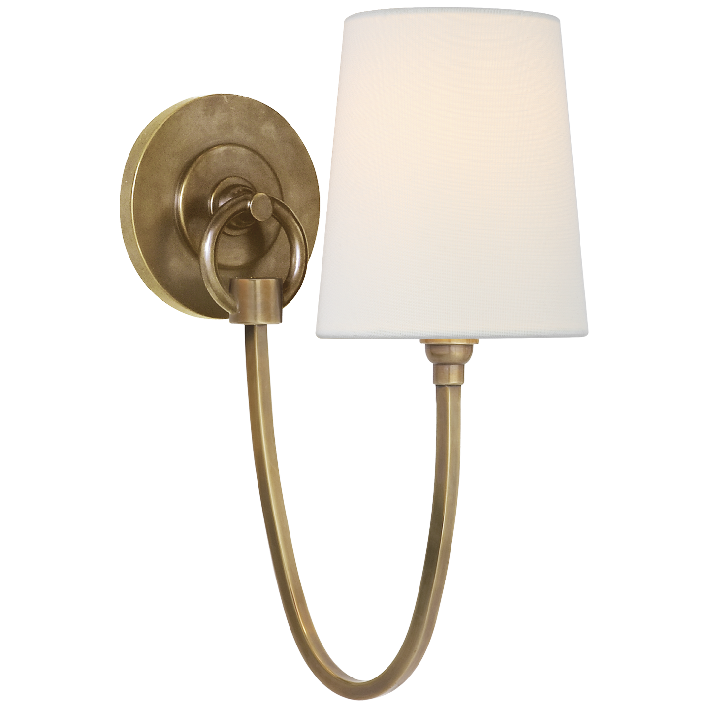 Stylowy kinkiet z szerokiej kolekcji Reed od amerykańskiego projektanta Thomas O’Brian. Lampa posiada lniane abażurki, które pięknie komponują się z lekką konstrukcją z mosiądzu. Kolekcja Reed składa się z żyrandoli w dwóch rozmiarach, lamp wiszących i kinkietów pojedynczych i podwójnych. Dzięki trzem wykończeniom metalu kolekcja jest niezwykle uniwersalna i pasuje do większości wnętrz: antyczny mosiądz, brąz, polerowany nikiel.
