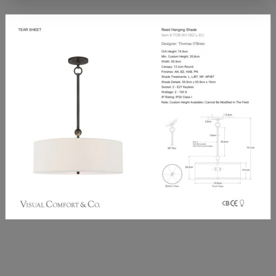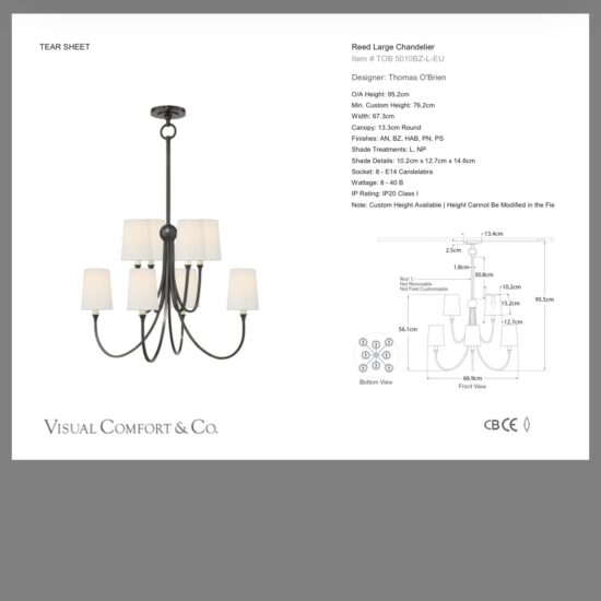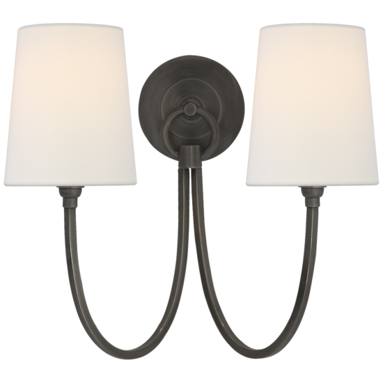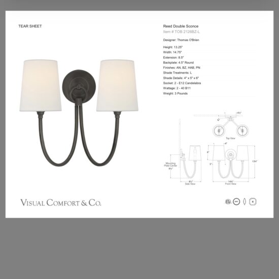 Stylowy kinkiet z szerokiej kolekcji Reed od amerykańskiego projektanta Thomas O’Brian. Lampa posiada lniane abażurki, które pięknie komponują się z lekką konstrukcją z brązu. Kolekcja Reed składa się z żyrandoli w dwóch rozmiarach, lamp wiszących i kinkietów pojedynczych i podwójnych. Dzięki trzem wykończeniom metalu kolekcja jest niezwykle uniwersalna i pasuje do większości wnętrz: antyczny mosiądz, brąz, polerowany nikiel.