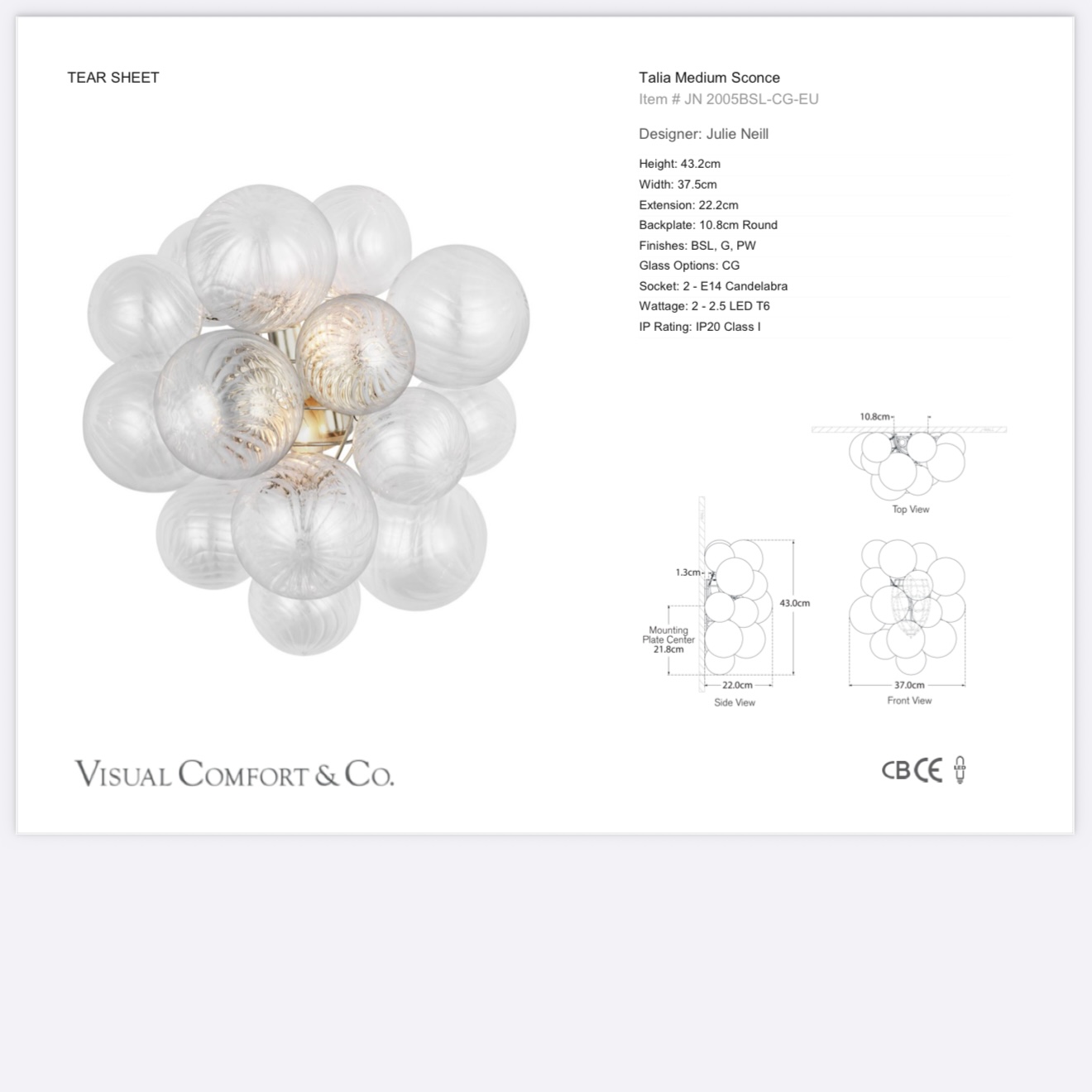 Artystyczne szkło wywyższa serię Talia od Julie Neill dla nowego ujęcia prostej oprawy szklanej kuli. Światło mieni się przez wielokrotne zakręcone szklane kule przymocowane do metalowych koszyków, tworząc kapryśny akcent. Dostępna w gamie rozmiarów i konfiguracji, seria Talia dodaje dynamiczną mieszankę migotącego szkła, zaokrąglonych form i jasnych detali każdemu wnętrzu.  IP20 Klasa I