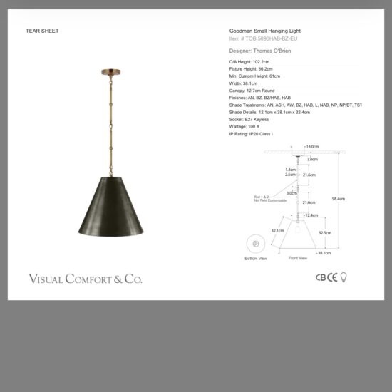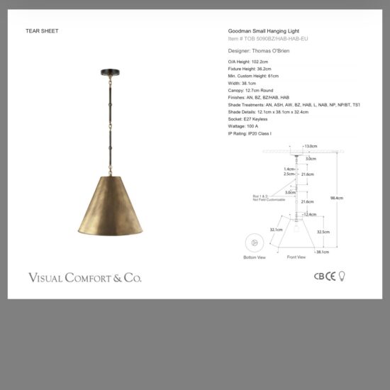 Seria Goodman od amerykańskiego projektanta Thomas O’Brian wprowadza prostotę i klasyczne proporcje do wnętrza. Stożkowy kształt dodaje nowoczesnej struktury nie przytłaczając bardziej casualowych wnętrz. Seria Goodman jest bogata w różne rozmiary, wykończenia metalu oraz kolory i materiały abażurów. Jest idealnym wyborem nad kuchenne wyspy. Wykończenie w brązie i antycznym mosiądzu nadaje lampie luksusowego wyglądu. Uwaga: abażur jest mosiężny od środka !