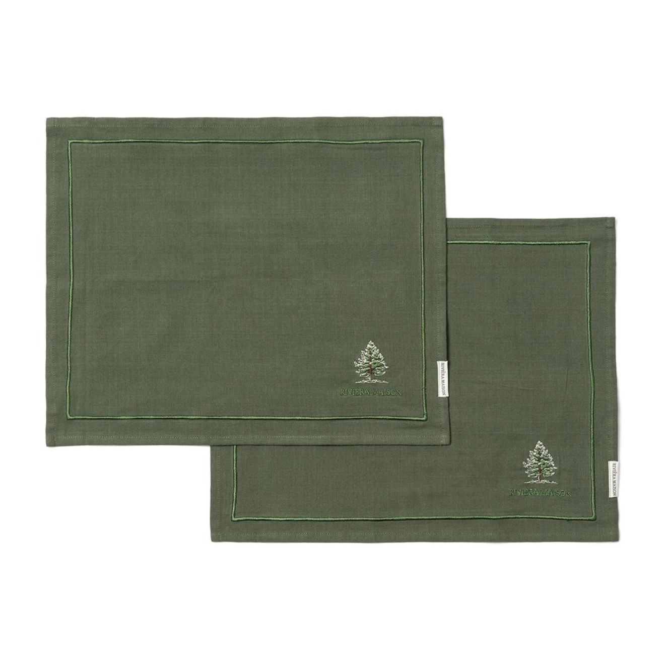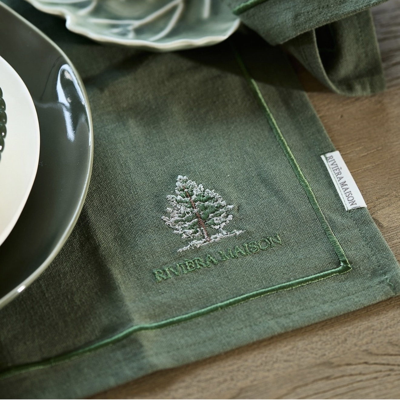 Komplet bawełnianych podkładek w pięknym zielonym kolorze z wyhaftowanym logo od Riviera Maison. Odkryj je wraz z serwetkami Woodlands do stworzenia tradycyjnej i przytulnej atmosfery nakrycia stołu podczas specjalnych okazji.