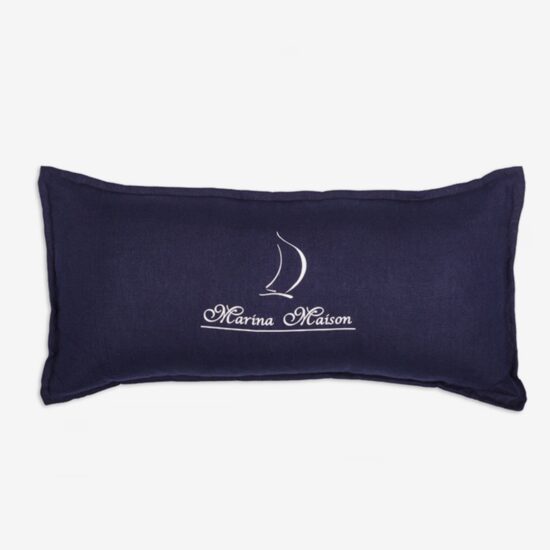 Piękna lniana poduszka w głębokim niebieskim kolorze z białym haftem The Hamptons oraz logo Marina Maison.