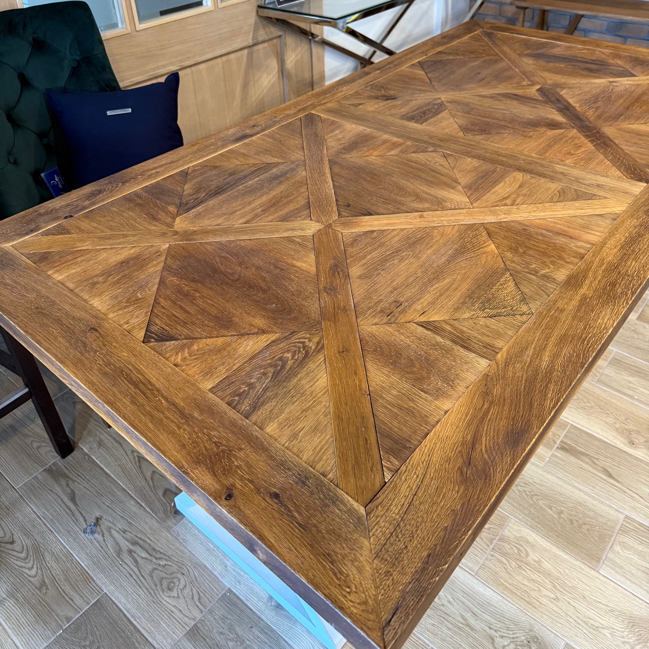 STÓŁ DĘBOWY MAISON to przepiękny stół z rustykalnym blatem, wykonanym z litej dębowej mozaiki. Stół świetnie współgra z wnętrzami Cottage, Farmhouse czy Hamptons . Stół może mieć również srebrne błyszczące nogi, przełamujące rustykalny blat.