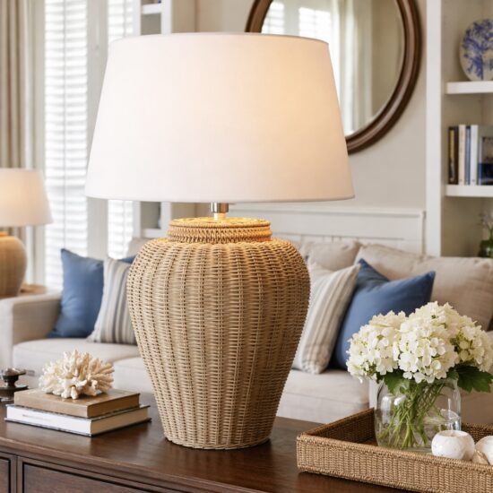 Inspirowana stylem Memphis Design, lampa stołowa Tiglia Kelly Wearstler definiowana jest przez użycie cylindrycznych podstaw z powtarzalnymi sferycznymi ozdobami po bokach. Lniane bębnowe klosze nakładają się na podstawy, tworząc jedną, spójną sylwetkę w neutralnych czarnych czy białych wykończeniach. Kreatywne lampy dodadzą współczesny akcent równie dobrze szafkom nocnym, kredensom czy blatom.